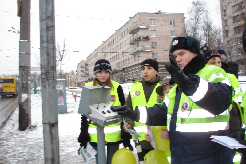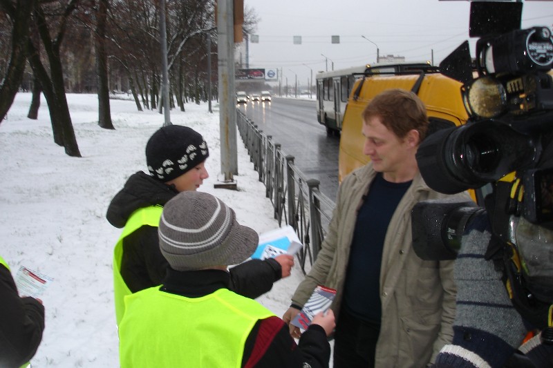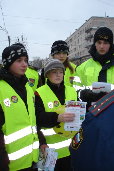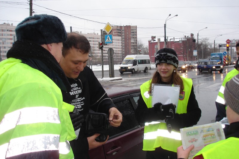 Члены отряда ЮИД «Клаксон» раздают водителям открытки, сделанные учащимися 377 школы. Мокрый снег не помешал ребятам осуществить задуманное. В течение месяца были актуальны рассказы о незабываемых впечатлениях участия в акции.